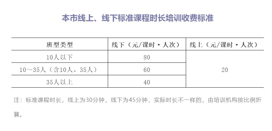 按照國家“要區(qū)分線上和線下以及不同班型,分類制定標(biāo)準(zhǔn)課程時長的基準(zhǔn)收費標(biāo)準(zhǔn)”的要求,根據(jù)國家規(guī)定的主要定價班型,確定了本市線上、線下學(xué)科類校外培訓(xùn)的基準(zhǔn)收費標(biāo)準(zhǔn)和浮動幅度。