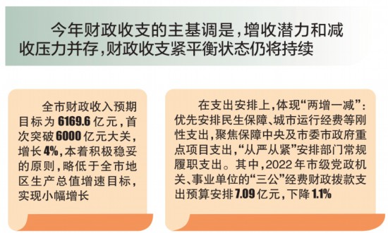在財(cái)政收支依然嚴(yán)峻的情況下,“緊平衡”態(tài)勢(shì)也呈現(xiàn)出與以往財(cái)政收入零增長(zhǎng)、負(fù)增長(zhǎng)不同的態(tài)勢(shì)。吳素芳介紹,2022年的“緊平衡”,主要體現(xiàn)為收入回歸常態(tài)運(yùn)行,但各領(lǐng)域資金需求快速增長(zhǎng)。財(cái)政部門(mén)要堅(jiān)決貫徹落實(shí)中央經(jīng)濟(jì)工作會(huì)提出的“積極的財(cái)政政策要提升效能,更加注重精準(zhǔn)、可持續(xù)”工作要求,通過(guò)調(diào)結(jié)構(gòu)、盤(pán)存量、抓統(tǒng)籌、保重點(diǎn)等方式做好保障。在支出安排上,體現(xiàn)“兩增一減”:優(yōu)先安排民生保障、城市運(yùn)行經(jīng)費(fèi)等剛性支出,聚焦保障中央及市委市政府重點(diǎn)項(xiàng)目支出,“從嚴(yán)從緊”安排部門(mén)常規(guī)履職支出。其中,2022年市級(jí)黨政機(jī)關(guān)、事業(yè)單位的“三公”經(jīng)費(fèi)財(cái)政撥款支出預(yù)算安排7.09億元,下降1.1%。