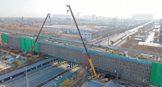京唐城際鐵路燕郊段跨思菩蘭路連續(xù)梁建設(shè)現(xiàn)場(chǎng)。 河北日?qǐng)?bào)記者 趙永輝攝