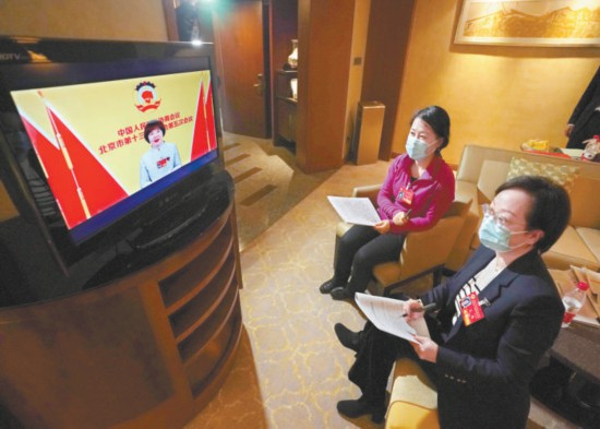 昨天晚上,市政協(xié)十三屆五次會議視頻播出大會發(fā)言,委員們在駐地各房間通過閉路電視、履職平臺APP收看。圖為民革界委員李鳳芹(右)和尤揚(yáng)(左)在房間收看委員發(fā)言。本報(bào)記者 方非攝