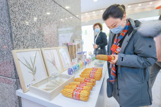 市農業(yè)農村局種業(yè)處一級調研員趙旻介紹,為配合做好《條例(草案)》審議工作,按照市人大農村辦的安排,市農業(yè)農村局會同市園林綠化局在人代會會場,以展板、實物等方式展現(xiàn)北京種業(yè)創(chuàng)新發(fā)展成就。玉米品種京科968、京科728、京單28,雜交小麥品種京麥系列,北京新三號大白菜、京葫36號、京欣西瓜等的種子,以及食用菌黃傘HS7、杏鮑菇13號、香菇京科1號的標本……豐富的展品,吸引了不少人大代表駐足?,F(xiàn)場還展示了菊花從組培苗到容器苗到成品苗的標準化無性繁育技術,通過組培、工廠化育苗技術繁育的11個蝴蝶蘭新品種更是扮靚會場。
