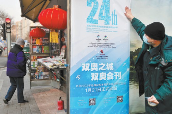 昨天上午,位于廣渠門內(nèi)大街富貴園購(gòu)物中心前的郵政報(bào)刊亭旁,三位來(lái)自北京郵政的工作人員正忙碌著。很快,三張印有“雙奧之城,雙奧會(huì)刊”“北京2022年冬奧會(huì)和冬殘奧會(huì)官方中文會(huì)刊1月21日正式出版”等字樣的嶄新海報(bào)貼上了報(bào)刊亭的公益宣傳欄。以白色和藍(lán)色為主色調(diào)的主題海報(bào)剛剛貼好,就立刻吸引了過往路人的駐足觀看:“這海報(bào)真有冬奧氛圍。”“冬奧會(huì)刊?到時(shí)候得來(lái)一份看看?!辈簧俾啡颂统鍪謾C(jī),對(duì)著海報(bào)上的預(yù)訂二維碼現(xiàn)場(chǎng)掃碼,了解具體情況。