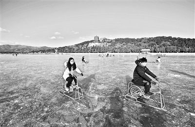 頤和園冰場(chǎng)的景色絕佳,冰場(chǎng)四周環(huán)繞著頤和園的亭臺(tái)樓閣,游客在冰面滑行的過程中,可切身感受到古人造園“步移景異”的精妙之處。冰上賞景的最佳選擇是騎行冰上自行車,冰上自行車幾乎對(duì)技術(shù)零要求,因?yàn)橛薪饘倏蚣艿闹?,騎行時(shí)比普通自行車還要平穩(wěn),冰上自行車可快可慢、可??烧?,游客呼吸著清冽的空氣,眼前則是高大雄偉的佛香閣與遼闊的西山群峰,盡管腳下在奮力地蹬車,在不知不覺間已融入到頤和園的山水畫卷之中。