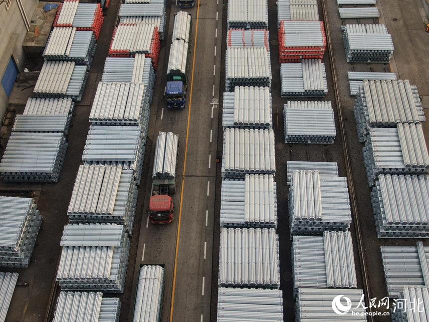 在河北省唐山市豐南區(qū)一家鍍鋅鋼管企業(yè)成品鍍鋅鋼管存放點,貨車滿載管材準備發(fā)車。崔光攝