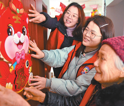 近日,安徽省當(dāng)涂縣五彩社會(huì)工作服務(wù)中心的志愿者與空巢老人一起貼年畫(huà),為老人家增添節(jié)日喜慶氣氛。
