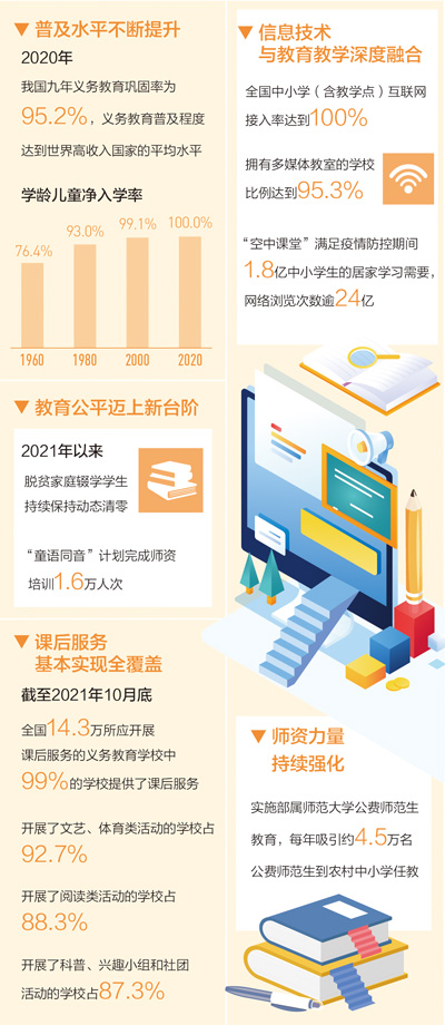 黨的十八大以來,在以習近平同志為核心的黨中央堅強領(lǐng)導下,我國義務教育取得了舉世矚目的成就:2020年,我國九年義務教育鞏固率為95.2%,義務教育普及程度達到世界高收入國家的平均水平;實施義務教育薄弱環(huán)節(jié)改善和能力提升項目,發(fā)展“互聯(lián)網(wǎng)+”教育助力城鄉(xiāng)教育均衡,全國義務教育基本均衡已經(jīng)全面實現(xiàn)……讓適齡兒童少年有學上、上好學,讓每個孩子都能享有公平而有質(zhì)量的教育,正在成為現(xiàn)實。
