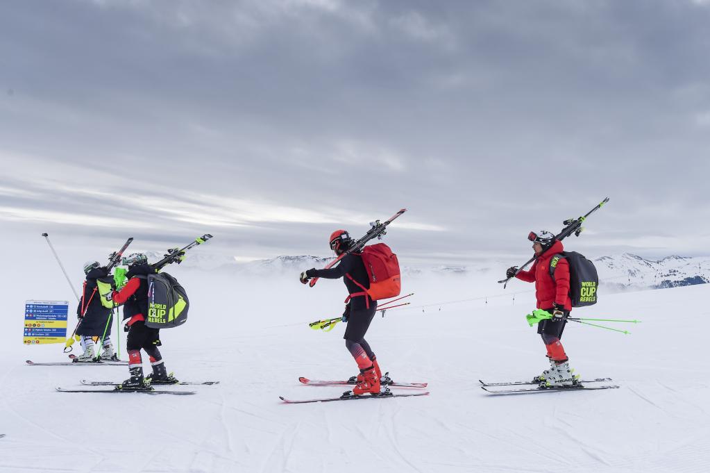 資料圖:2019年4月5日,中國國家高山滑雪集訓隊在奧地利蒂羅爾州一處雪場內(nèi)前往訓練比賽區(qū)域。新華社記者 郭晨 攝
