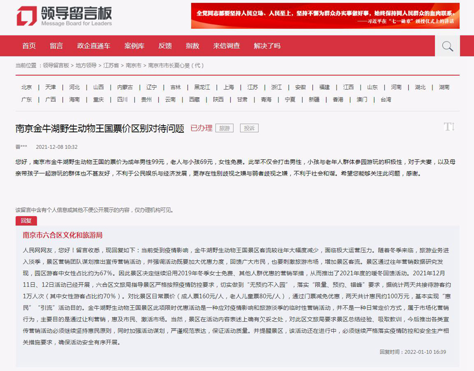 2021年12月8日,網(wǎng)友在人民網(wǎng)“領(lǐng)導(dǎo)留言板”向南京市市長留言稱,南京市金牛湖野生動(dòng)物王國的票價(jià)為成年男性99元,老人與小孩69元,女性免費(fèi)。此舉不僅打擊男性、小孩與老年人參園游玩的積極性,而且對于夫妻以及母親帶孩子一起游玩的群體也不甚友好,不利于公民娛樂與經(jīng)濟(jì)發(fā)展,另外更存在性別歧視與弱者歧視之嫌,不利于社會(huì)和諧。