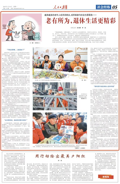 老年人在言傳身教、化解矛盾、傳幫帶等方面具有獨(dú)特優(yōu)勢(shì)。隨著中國人口人均壽命延長(zhǎng)和健康狀況改善,越來越多的老年人由過去退休在家休閑娛樂、頤養(yǎng)天年,轉(zhuǎn)為繼續(xù)參與社會(huì)服務(wù)和建設(shè)。如今,無論是科技、教育、醫(yī)療衛(wèi)生領(lǐng)域,還是大街小巷的志愿服務(wù)站點(diǎn),都活躍著大批退休老人的身影,他們?cè)凇袄嫌兴鶠椤敝姓业叫碌膬r(jià)值和樂趣,活出了老年人的精彩。