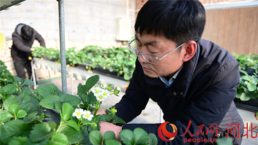 人民網(wǎng)保定1月17日電 17日,在保定市曲陽縣晾甲山現(xiàn)代農(nóng)業(yè)園區(qū)草莓大棚內(nèi),園區(qū)負(fù)責(zé)人段少輝仔細(xì)查看草莓蜜蜂授粉及授粉后坐果情況。當(dāng)下,正值花期果期的曲陽縣千畝保護(hù)地溫室大棚花香四溢,隨處可見熊蜂、蜜蜂授粉的忙碌身影。