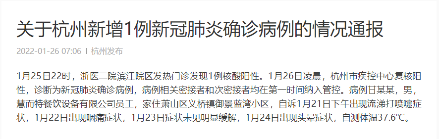 1月25日22時(shí),浙醫(yī)二院濱江院區(qū)發(fā)熱門診發(fā)現(xiàn)1例核酸陽(yáng)性。1月26日凌晨,杭州市疾控中心復(fù)核陽(yáng)性,診斷為新冠肺炎確診病例,病例相關(guān)密接者和次密接者均在第一時(shí)間納入管控。病例甘某某,男,慧而特餐飲設(shè)備有限公司員工,家住蕭山區(qū)義橋鎮(zhèn)御景藍(lán)灣小區(qū),自訴1月21日下午出現(xiàn)流涕打噴嚏癥狀,1月22日出現(xiàn)咽痛癥狀,1月23日癥狀未見明顯緩解,1月24日出現(xiàn)頭暈癥狀,自測(cè)體溫37.6℃。