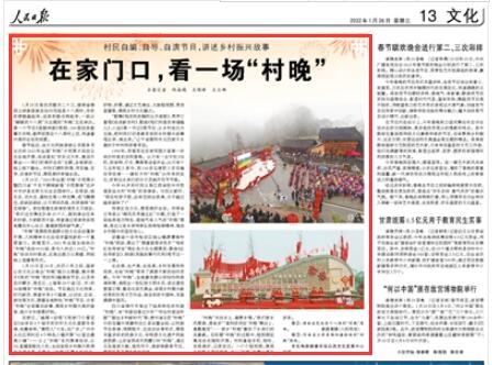 1月25日至26日,農(nóng)歷小年之際,國(guó)家公共文化云推出“村晚”接力云展播,集中展示《我的“村晚”我的年》融媒體節(jié)目,以及來(lái)自?xún)?nèi)蒙古、黑龍江、上海等20個(gè)省(區(qū)、市)的30場(chǎng)精彩“村晚”活動(dòng)。節(jié)目通過(guò)文化傳承、時(shí)代新風(fēng)、展望未來(lái)3個(gè)篇章,以訪談、互動(dòng)、游戲等方式,展播各地特色“村晚”節(jié)目、分享“村晚”臺(tái)前幕后故事、展現(xiàn)鄉(xiāng)村振興美好畫(huà)卷、推介鄉(xiāng)村美景好物。