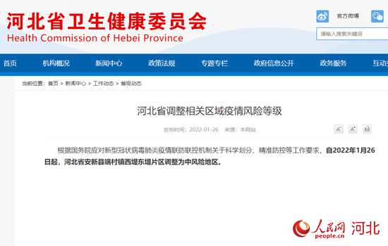 人民網(wǎng)石家莊1月26日電 據(jù)河北省衛(wèi)健委官方網(wǎng)站消息,根據(jù)國務(wù)院應(yīng)對(duì)新型冠狀病毒肺炎疫情聯(lián)防聯(lián)控機(jī)制關(guān)于科學(xué)劃分、精準(zhǔn)防控等工作要求,自2022年1月26日起,河北省安新縣端村鎮(zhèn)西堤?hào)|堤片區(qū)調(diào)整為中風(fēng)險(xiǎn)地區(qū)。
