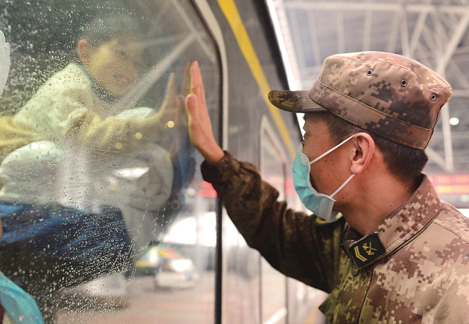 26日,隨著虎年春節(jié)臨近,南京火車站迎來(lái)春運(yùn)客流高峰。返鄉(xiāng)旅客懷著對(duì)“家”滿滿的愛(ài)踏上旅程。圖為一位解放軍戰(zhàn)士與返鄉(xiāng)的兒子隔著車窗玻璃把手掌疊在一起。本報(bào)記者 郎從柳 攝