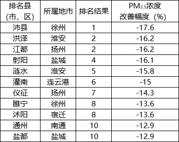 PM2.5濃度改善幅度相對(duì)較好的前10位(1-10名)依次是:沛縣、洪澤(江都并列)、射陽(yáng)、漣水、灌南、儀征、睢寧(沭陽(yáng)并列)、通州(鹽都并列)。