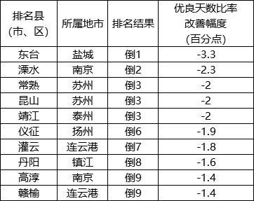 優(yōu)良天數(shù)比率改善幅度相對(duì)較差的后10位(倒1-10名)依次是:東臺(tái)、溧水、常熟(昆山、靖江并列)、儀征、灌云、丹陽(yáng)、高淳(贛榆并列)