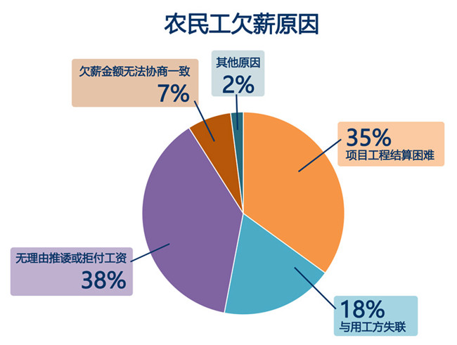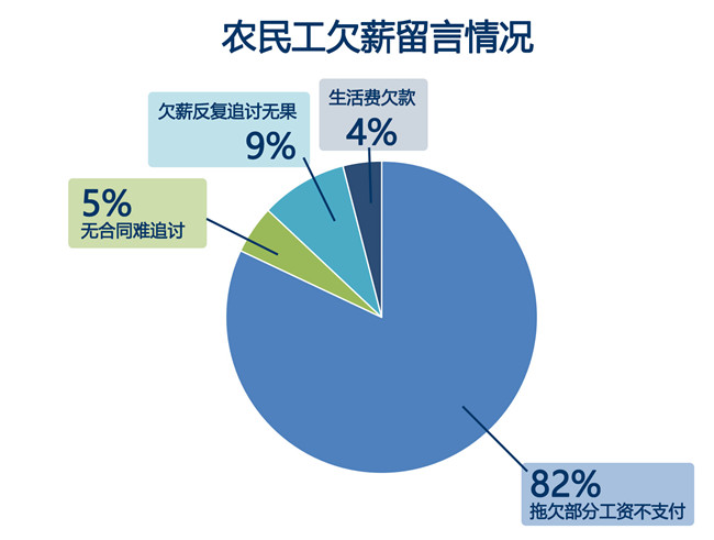 在群眾留言中,農(nóng)民工欠薪的情況大部分為薪資未全額支付,這類占留言總數(shù)的約82%;無勞動合同、反復(fù)追討無果以及拖欠生活費(fèi)的情況也有發(fā)生。項(xiàng)目工程結(jié)算困難、用工方推諉則是導(dǎo)致欠薪的主要原因。