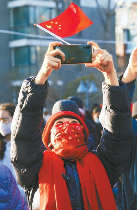 昨天,“重啟”的百旺茉莉園一期充滿了新年的喜慶,在小區(qū)南門廣場(chǎng)處,孩子們和居民們一起高唱《歌唱祖國(guó)》《明天會(huì)更好》,表達(dá)感激和喜悅之情。本報(bào)記者 王海欣攝