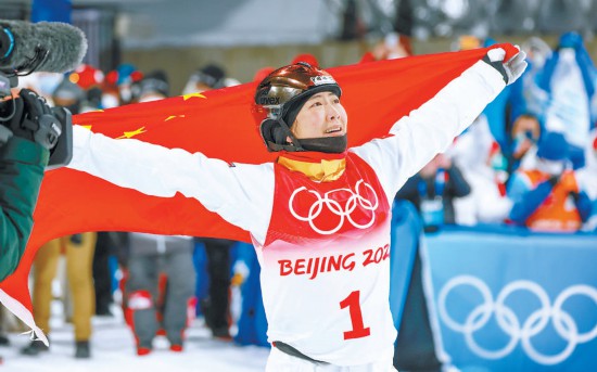 北京冬奧會(huì)自由式滑雪女子空中技巧決賽最終輪一跳定勝負(fù),中國(guó)隊(duì)徐夢(mèng)桃奪得金牌。 本報(bào)記者 潘之望攝