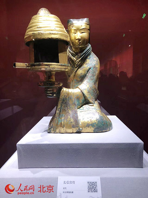 長(zhǎng)信宮燈是2000多年前的西漢宮燈,造型輕巧華麗,設(shè)計(jì)巧妙環(huán)保。人民網(wǎng)記者 鮑聰穎攝