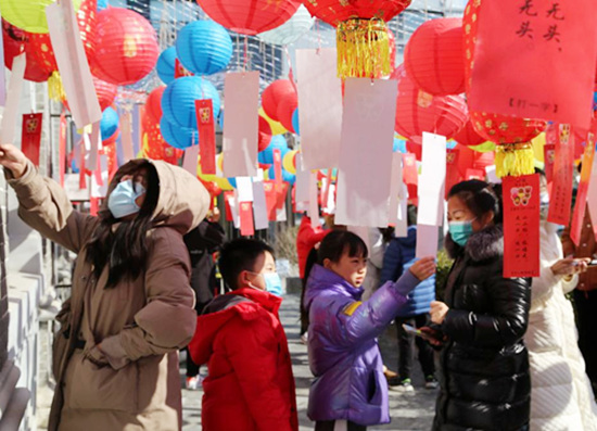 在百年建筑九如樓前的花燈廣場,200件掛有傳統(tǒng)燈謎的彩色宣紙燈籠與北京雪后藍(lán)天相映成趣,全天開放燈謎游戲供民眾互動(dòng)參與。