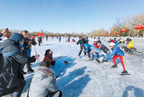 “雙奧之城新氣象——2022中外媒體北京行”走進(jìn)什剎海冰場深入體驗(yàn)老北京冰雪趣味運(yùn)動(dòng)。本報(bào)記者 吳鏑攝