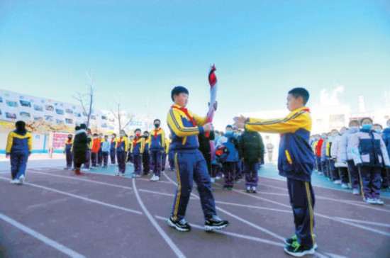 操場上,一場模擬火炬?zhèn)鬟f儀式開始了。孩子們高舉火炬,神采奕奕。薛東說,這支火炬將入藏該校的“小小冬奧博物館”,成為該校冬奧教育的一部分。
