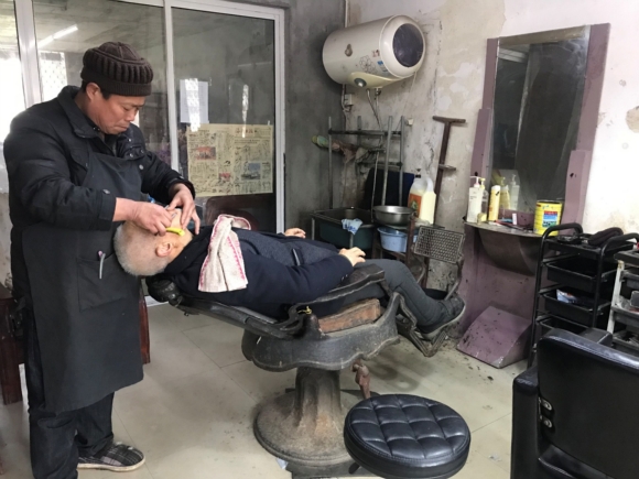 “推好了,來,再洗下,然后刮刮胡子?!?對話間,沈建平引導(dǎo)嚴老師到水池旁,用熱水沖洗了頭,然后請嚴老師躺到了另一張“古董”椅子上,繼續(xù)麻利地修面和刮胡子。