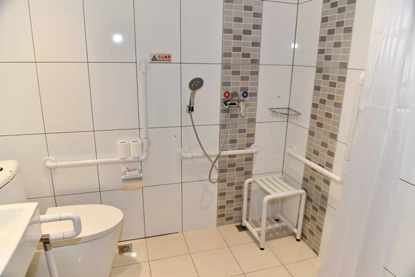 酒店前臺(tái)設(shè)置了低位服務(wù)臺(tái),坐著就可以辦理入住登記等手續(xù)。進(jìn)入電梯后,電梯按鈕上附有盲文,方便視力障礙人士使用;鏡面、扶手、語(yǔ)音播報(bào)一應(yīng)俱全。來(lái)到客房部,走廊平整開(kāi)闊,鋪設(shè)了防滑地膠,客房的房門也進(jìn)行了拓寬。進(jìn)入客房?jī)?nèi),低位開(kāi)關(guān)、無(wú)障礙寫字桌、開(kāi)放式衣柜等,讓人感覺(jué)溫暖、舒適。衛(wèi)生間里配備了各類無(wú)障礙設(shè)施,淋浴區(qū)一側(cè)的墻壁上裝有無(wú)障礙扶手,并配備了無(wú)障礙淋浴椅和寬大的浴室鏡等。低位洗手盆旁邊,是低位置物架,上面放著擦手巾。