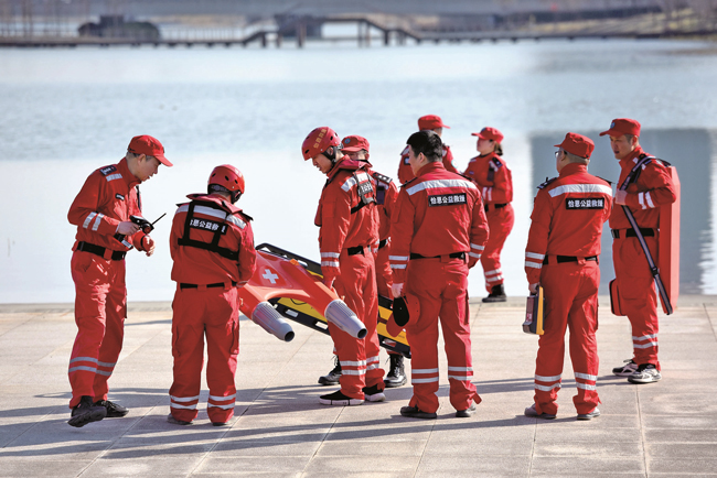 2月24日下午,在嘉興秀湖畔,怡恩公益救援隊組織隊員開展應急救援訓練,以此提高隊員們的應急救援能力。(馮玉坤)