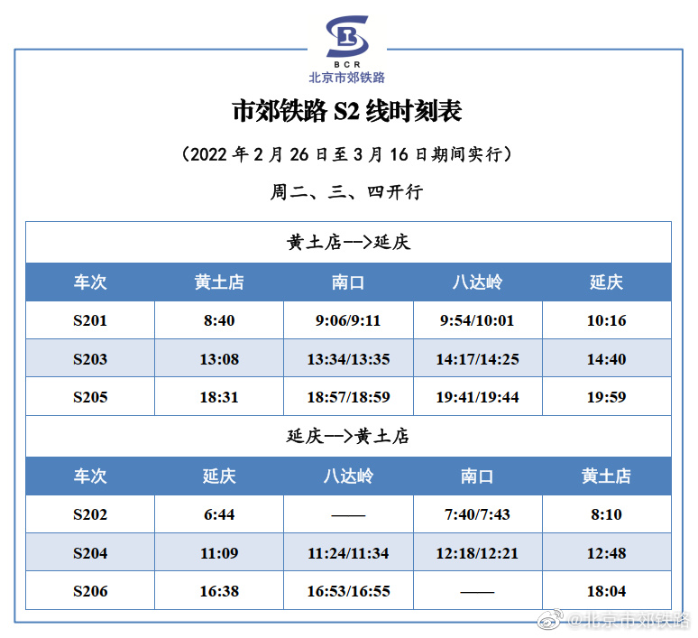 人民網(wǎng)北京2月25日電 據(jù)北京市郊鐵路官方微博消息,根據(jù)鐵路運(yùn)輸調(diào)整通知,2022年2月26日至3月16日, S2線恢復(fù)周二、三、四3對(duì)/日,周五、六、日、一及小長假7對(duì)/日的列車開行方案,列車開行時(shí)點(diǎn)無變化,具體列車時(shí)刻表如下所示。