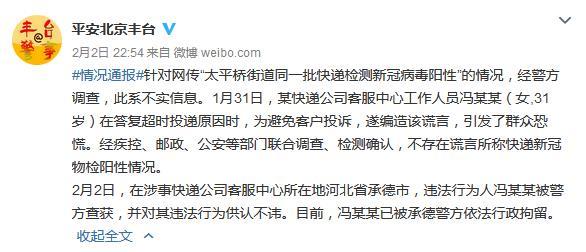 據(jù)北京豐臺(tái)公安分局官方微博消息,針對(duì)網(wǎng)上流傳“太平橋街道同一批快遞檢測(cè)新冠病毒陽性”的情況,經(jīng)警方調(diào)查,此系不實(shí)信息。1月31日,某快遞公司客服中心工作人員馮某某(女,31歲)在答復(fù)超時(shí)投遞原因時(shí),為避免客戶投訴,遂編造該謊言,引發(fā)了群眾恐慌。經(jīng)疾控、郵政、公安等部門聯(lián)合調(diào)查、檢測(cè)確認(rèn),不存在謊言所稱快遞新冠物檢陽性情況。