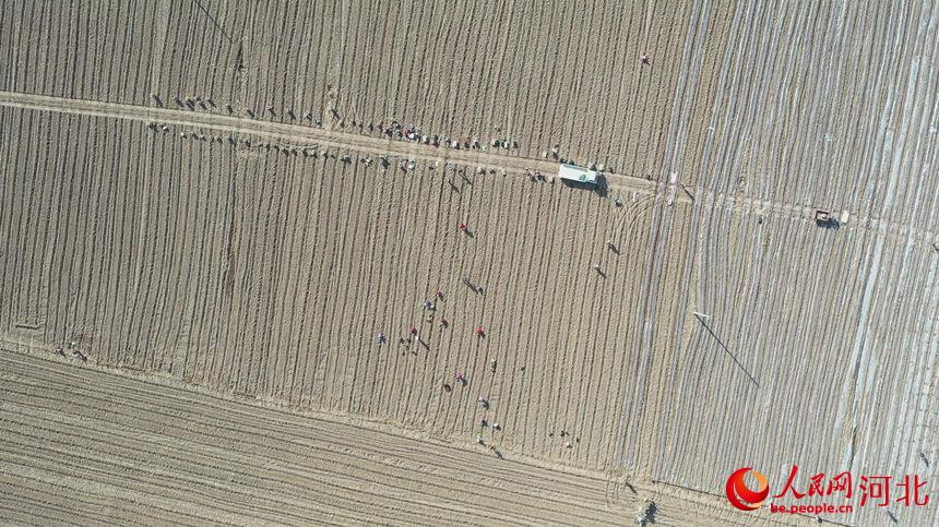 在河北省邯鄲市邱縣古城營鎮(zhèn)東杜林疃千畝西蘭花基地,村民正在栽植西蘭花苗(無人機照片)。孫海峰攝