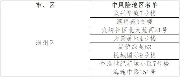 通告稱,根據(jù)國務(wù)院聯(lián)防聯(lián)控機制有關(guān)規(guī)定,經(jīng)綜合評估研判,市指揮部決定,自2022年3月6日0時起,將眾興華庭7號樓、潤琦苑3號樓、九嶺社區(qū)北大荒西21號、天景美地4號樓、溫僑綠苑B2、悅城國際9號樓、香溢世紀花城小區(qū)7號樓、海連中路151號調(diào)整為中風(fēng)險地區(qū),其他地區(qū)風(fēng)險等級不變。
