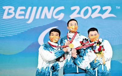 3月7日,北京冬殘奧會殘奧單板滑雪男子障礙追逐UL級比賽在云頂滑雪公園舉行,三位來自河北的“零零后”選手紀(jì)立家、王鵬耀、朱永鋼分獲金、銀、銅牌,取得了我國、河北省在冬殘奧會該項(xiàng)目的歷史性突破。當(dāng)晚該項(xiàng)目的頒獎儀式上,3面五星紅旗同時升起,激動人心。