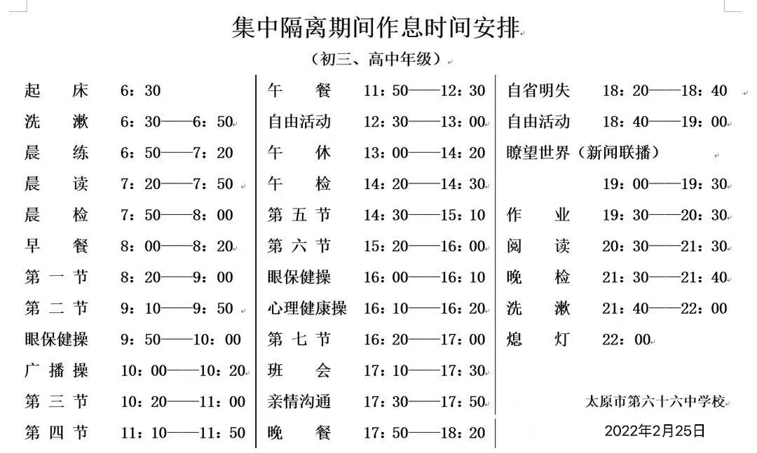 六十六中位于太原市尖草坪區(qū)迎新街迎新東二條,有兩棟教學(xué)樓,分別為初中部與高中部,是一所完全中學(xué)。為了最大程度保證正常教學(xué)秩序,學(xué)校在當(dāng)天就開始制定作息時(shí)間表,根據(jù)學(xué)生不同年齡段的特點(diǎn),分年級安排部署了隔離期間師生的學(xué)習(xí)與生活。