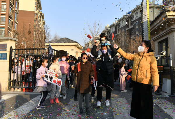 在潤澤悅溪小區(qū)門口,工作人員快速拆除快遞架,小區(qū)大門緩緩打開,居民們興高采烈地結(jié)伴走出小區(qū)。社區(qū)黨委書記、居委會(huì)主任分別向志愿者代表頒發(fā)證書并送上鮮花,向入駐社工、民警、機(jī)關(guān)工作人員獻(xiàn)上鮮花,為社區(qū)衛(wèi)生服務(wù)中心和來廣營派出所送錦旗,為愛心企業(yè)頒發(fā)獎(jiǎng)牌。居民代表向社區(qū)黨委及小區(qū)物業(yè)送錦旗。3月8日也是國際婦女節(jié),地區(qū)特意制作了電子賀卡,為每位女性同胞送上節(jié)日祝福。