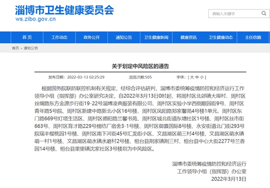 人民網(wǎng)淄博3月13日電(鄭浦麗)據(jù)淄博市衛(wèi)生健康委員會官網(wǎng)消息,根據(jù)國務(wù)院聯(lián)防聯(lián)控機(jī)制有關(guān)規(guī)定,經(jīng)綜合評估研判,淄博市委統(tǒng)籌疫情防控和經(jīng)濟(jì)運(yùn)行工作領(lǐng)導(dǎo)小組(指揮部)辦公室研究決定,自2022年3月13日0時起,將周村區(qū)北郊鎮(zhèn)大埠村、周村區(qū)絲綢路東方金源步行街19-22號淄博凌典服裝有限公司、周村區(qū)實(shí)驗(yàn)小學(xué)西側(cè)順園街9號、周村區(qū)青年路5號院、周村區(qū)新建中路新北小區(qū)16號樓、周村區(qū)鳳陽路鄭家馨苑4號樓1單元、周村區(qū)東門路669號燈塔生活區(qū)、周村區(qū)德陽路蘭馨書苑、周村區(qū)城北街道東塘社區(qū)1號樓、周村區(qū)絲市街663號、周村區(qū)育才路229號棉紡廠宿舍3-1號樓、周村區(qū)御景國際8號樓、永安街道北門街293號院瑞豐櫻桃園1號樓、周村區(qū)南下河街45號匯龍街小區(qū)、文昌湖區(qū)萌三村4號樓、文昌湖區(qū)萌水鎮(zhèn)萌一村1號樓、文昌湖區(qū)萌水鎮(zhèn)水磨村2號樓、桓臺縣荊家鎮(zhèn)荊三村、桓臺縣中心大街2277號蘭香園14號樓、桓臺縣果里鎮(zhèn)沈家社區(qū)3號樓劃為中風(fēng)險(xiǎn)區(qū)。