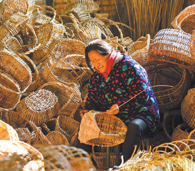2021年12月28日,安徽省阜陽市阜南縣郜臺鄉(xiāng)劉店村農(nóng)戶在“柳編巷”內(nèi)加工編織工藝品。
