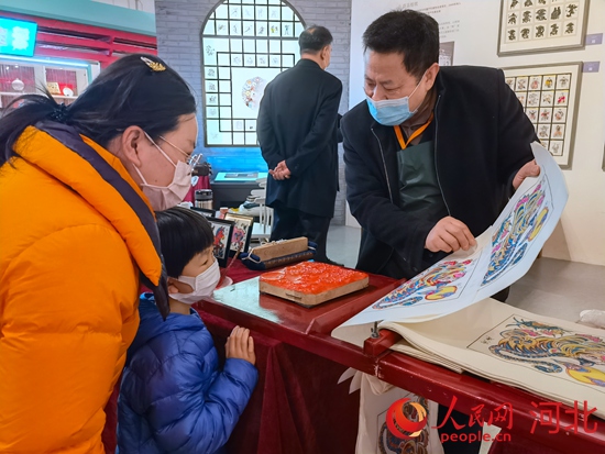武強木版年畫省級非遺傳承人康英勤向小朋友介紹武強木版年畫。 河北省群眾藝術(shù)館(省非遺保護中心)供圖