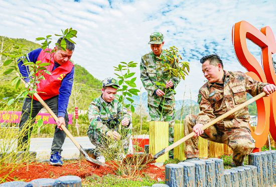 近日,在即將奔赴軍營前夕,金華婺城區(qū)莘畈鄉(xiāng)兩名應(yīng)征入伍的青年,積極參加鄉(xiāng)里組織的植樹活動,將一棵棵樹苗種進土壤,也在心中種下保衛(wèi)祖國、報效祖國的種子。(吳潮宏)