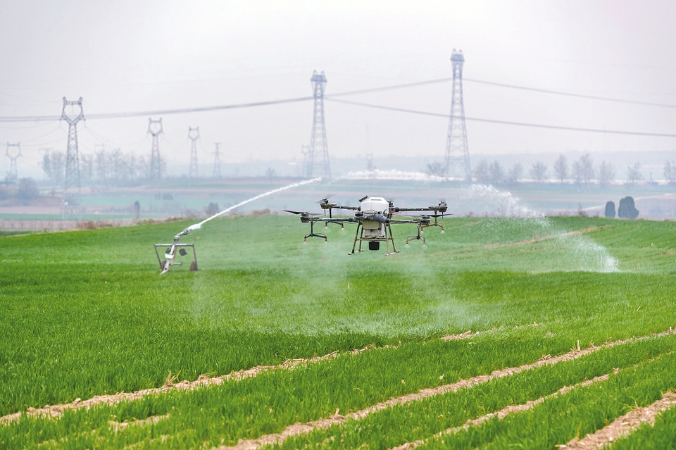 3月21日,在運城市夏縣胡張鄉(xiāng)新晉村有機旱作小麥基地,當?shù)剞r(nóng)民利用植保無人機為麥田施肥。眼下正值春耕春管的關(guān)鍵期,夏縣糧農(nóng)搶抓有利農(nóng)時,對全縣31.6萬畝冬小麥開展病蟲草害和極端天氣的應(yīng)對防范,及早動手澆水、施肥、噴藥,全面開展春季麥田管理,提高畝產(chǎn)效益,為全年糧食豐收打下堅實基礎(chǔ)。(閆鑫攝)