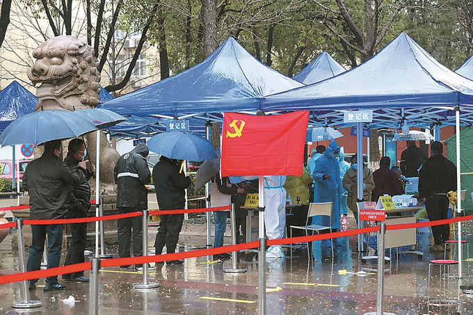 南京市發(fā)布關(guān)于疫情防控措施動(dòng)態(tài)升級(jí)調(diào)整的通告(第11號(hào)),自21日起,南京市在全市開展新一輪分區(qū)域規(guī)模性核酸檢測(cè)。圖為鼓樓區(qū)下關(guān)街道閱江樓核酸檢測(cè)點(diǎn),市民在接受核酸采樣。 本報(bào)記者 陳儼 攝