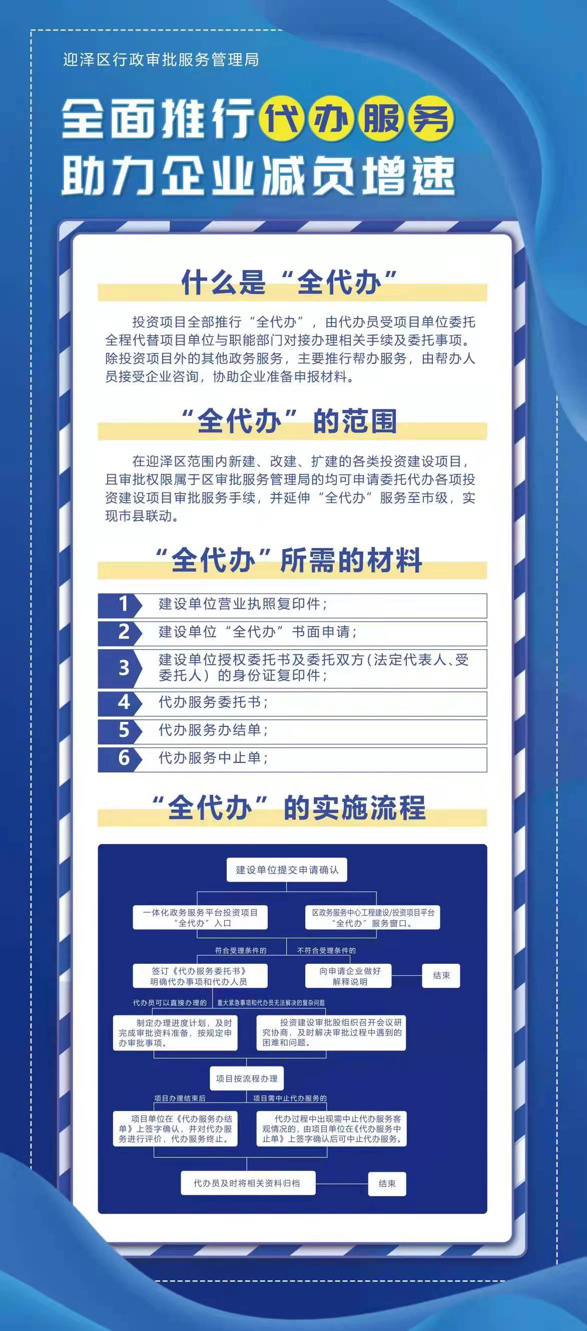 據(jù)介紹,針對項(xiàng)目審批手續(xù)多、時限長等問題,太原市迎澤區(qū)行政審批局梳理堵點(diǎn)痛點(diǎn),實(shí)施流程再造,開展了投資項(xiàng)目建設(shè)“全代辦”服務(wù),按照“合法高效、自愿委托、無償服務(wù)、全程跟蹤、協(xié)同聯(lián)動”的原則,為企業(yè)提供委托項(xiàng)目一部門辦、一窗入件、一人代跑、一律免費(fèi)的“全代辦”服務(wù)。