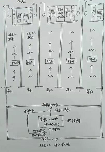正如祁媛媛所說,靈感來(lái)源于實(shí)踐。靠著連日來(lái)在檢測(cè)一線工作的體驗(yàn),祁媛媛不斷摸索,反復(fù)思考,根據(jù)1-6個(gè)工位的不同組合,手繪了6張檢測(cè)流程圖,上面清晰地標(biāo)注著檢測(cè)的動(dòng)線、每個(gè)環(huán)節(jié)以及對(duì)應(yīng)的功能和注意事項(xiàng),從而能夠直觀地指導(dǎo)居村提升檢測(cè)效率,讓檢測(cè)如“流水線”般高效順暢。