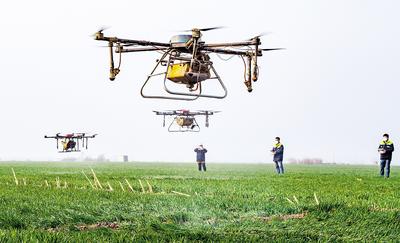 3月19日,石家莊市溫德格信農(nóng)業(yè)科技有限公司工作人員在石家莊市欒城區(qū)南高鄉(xiāng)魯家莊村麥田里使用無(wú)人植保機(jī)作業(yè)。河北日?qǐng)?bào)通訊員 李明發(fā)攝