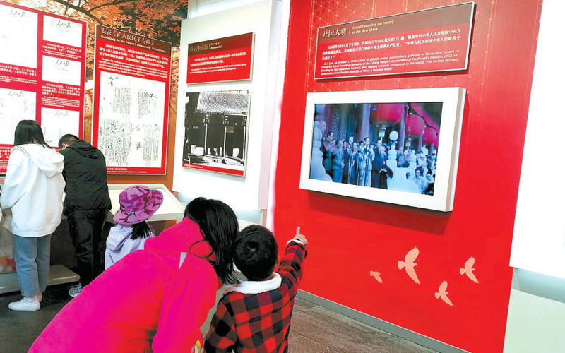 展覽當(dāng)中的一段開(kāi)國(guó)大典的影像資料讓游客們紛紛駐足。“中華人民共和國(guó)中央人民政府今天成立了!”聽(tīng)到錄音里毛主席的這段莊嚴(yán)宣告,游客們不由地挺直了腰桿。