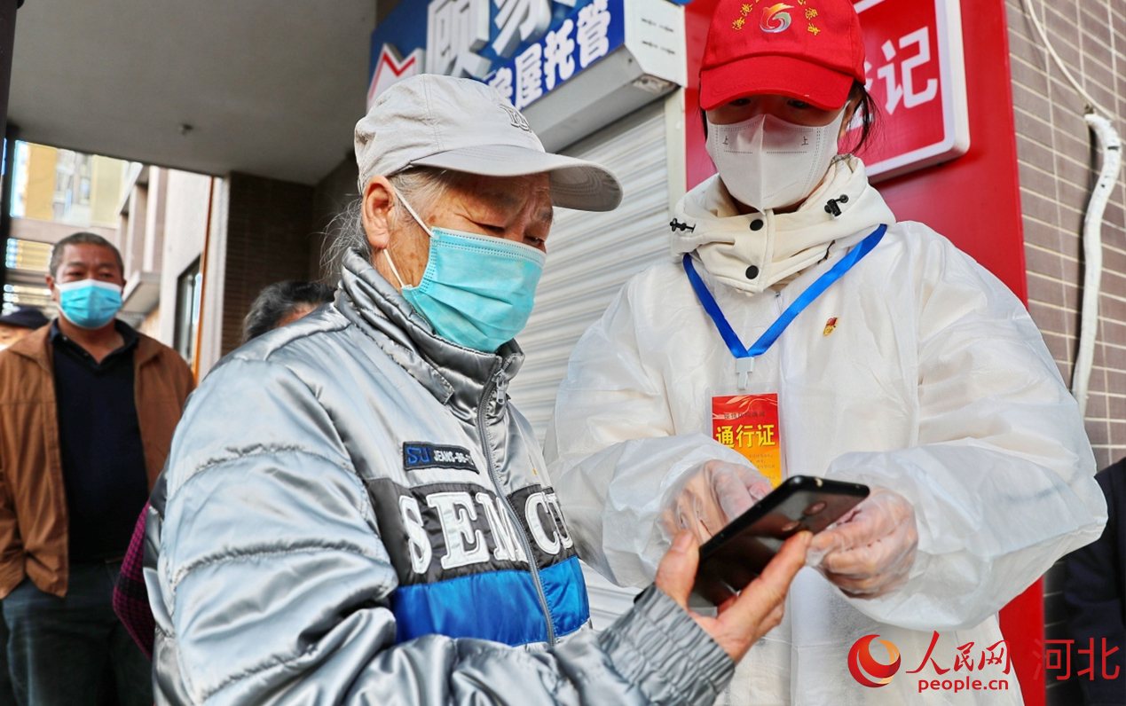 人民網(wǎng)石家莊3月27日電 “打開(kāi)電子健康碼?!薄氨3趾?米距離?!薄?月25日上午9點(diǎn),在河北秦皇島市海港區(qū)森林逸城小區(qū),秦皇島市委組織部黨員先鋒隊(duì)隊(duì)員董菁正在組織居民有序排隊(duì)做核酸檢測(cè),提醒大家準(zhǔn)備好電子健康碼,耐心指導(dǎo)不熟悉操作流程的居民。