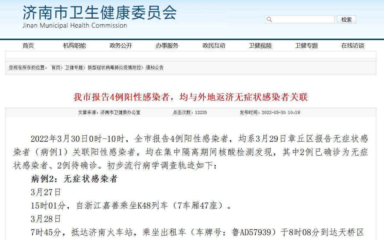 濟南市報告4例陽性感染者,均與外地返濟無癥狀感染者關聯(lián)