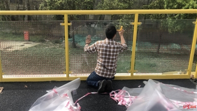 該座天橋大約有三分之一的玻璃護(hù)欄已經(jīng)貼上了膜。未貼膜的玻璃護(hù)欄有的橫著拉了兩條“警戒線”,有的拉了三條?!耙涣硕嗑镁湍苜N完了”,現(xiàn)場工作人員表示,“警戒線”是臨時措施,貼完膜就會取掉。